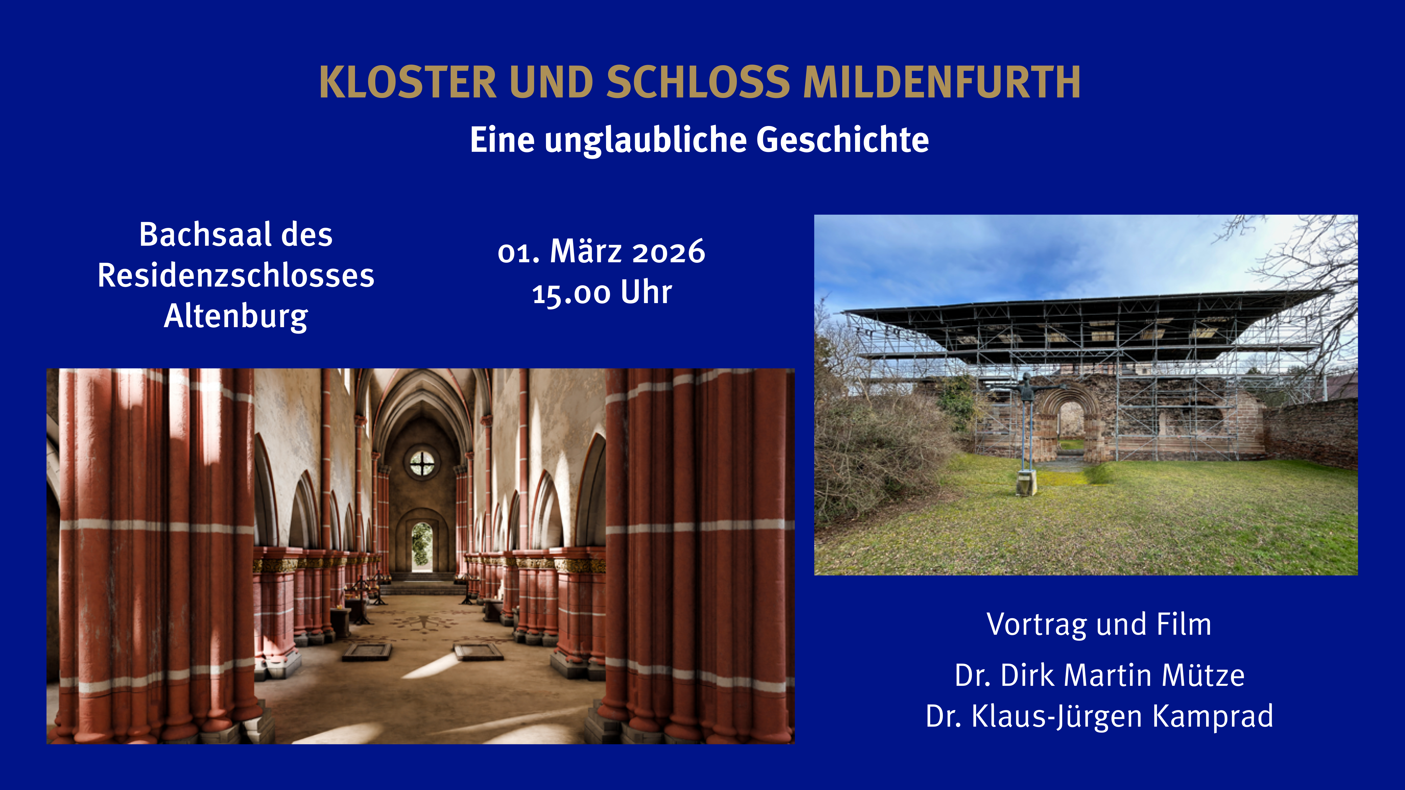 In seinem Vortrag geht Dr. Dirk Martin Mütze auf die wechselvolle Geschichte des ehemaligen Klosters und dessen Kirche, später zu einem Schloss gebaut, ein. Dass es sich beim heutigen Schloss Mildenfurth einstmals um eine romanische Klosterkirche handelte, lässt sich nur noch an einigen wenigen Resten erkennen. Gegründet wurde das Kloster im Jahr 1193 durch Heinrich II. Vogt von Weida und dessen Frau Berta. Mildenfurth sollte ihnen als Hauskloster und Grablege dienen, nebenbei war es eines der wenigen Prämonstratenserklöster in Thüringen. Die ersten Mönche stammten aus dem Magdeburger Mutterkloster Unser Lieben Frauen. Das Konvent entwickelte sich zu einem geistlich-kulturellen Zentrum der Region. Durch Flößerei, Silberbergbau und Landwirtschaft gewann es wirtschaftlichen Einfluss und Reichtum.